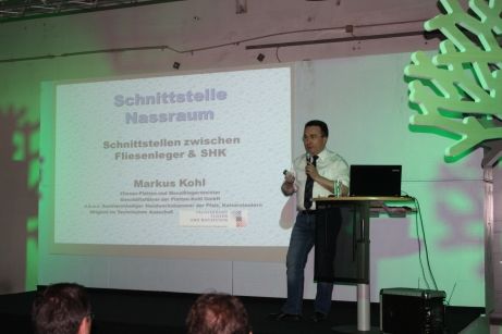 Sein Vortrag „Schnittstellenprobleme zwischen Installateur- und Heizungsbauerhandwerk und Fliesen-, Platten- und Mosaiklegerhandwerk“ traf genau den Nerv der Zuhörer. Ein wichtiger Aspekt war das Thema „Abdichtung“. Bereits die Einleitung ließ die Zuhörer staunen: Markus Kohl zitierte die Bibel, in der die erste Abdichtung der Menschheit erwähnt wurde: beim Bau der Arche Noah.