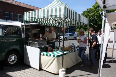 In der Zwischenzeit bezog auch der „Wurst-Bully“ seinen Platz und bereitete seine Spezialität - Pulled Pork Burger - für die Gäste vor. Die Mittagspause wurde von allen genutzt, um sich zu stärken, die vorherigen Themen in Einzelgesprächen zu vertiefen oder einfach die Sonne zu genießen.
