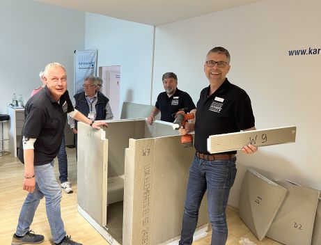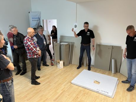 Tag 2 war im Rahmen der „Akademie des Handwerks" komplett der Praxis gewidmet. Während im Außenbereich – in Kooperation mit der Firma Schönox - unsere neue Bauplatte für Fußbodenheizungen FLOOR WH F verlegt wurde, präsentierte unser Team im Innenbereich den Aufbau ein Modell-Dampfbads im Maßstab 1:2.