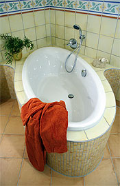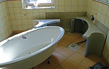 Jede Renovierung will exakt geplant sein, denn Arbeitszeit kostet. Wer richtig plant, spart Material- und Lohnkosten. Leicht zu bearbeiten, schnell zu verarbeiten – das ist ein Hauptcharakteristikum der Hartschaum- Trägerelemente von LUX ELEMENTS. Und das waren auch die entscheidenden Kriterien für die Entscheidung zugunsten des eingesetzten Systems. Nach der just-in-time-Lieferung mußten die Handwerker die vorgefertigten Einzelteile nur noch vor Ort zusammensetzen, verkleben und an den Element stößen armieren. Die Montagezeit betrug lediglich 30 Minuten. Gegen über herkömmlichen Maurerarbeiten lag die Kostenersparnis bei ca. 40 Prozent. Das Design der Fliesen sowie die Formate, die auf den Hartschaum- Trägerelementen verarbeitet werden, sind frei wählbar. In Neustadt entschieden sich die Eigentümer für die Verlegung kleinformatiger Fliesen in einem warmen Terracottaton.