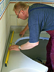 Der Handwerker richtet die vorgefertigten Teile mit der Wasserwaage aus. Er prüft die Maßhaltigkeit und Paßgenauigkeit.