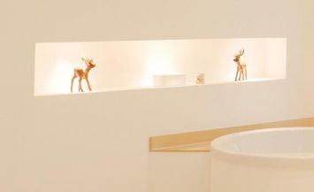 Ein besonderer Blickfang ist die beleuchtete Wandnische. Die die Wanne umgebenden Wände wurden neu aufgebaut. Auch hier kamen Hartschaum-Trägerelemente zum Einsatz. Das Ständerwerk wurde mit ELEMENT Bauplatten beplankt und die Nische ausgeformt. Der passgenaue Kasten wurde ebenfalls vorgefertigt geliefert. Die gute Bearbeitbarkeit des Materials ermöglicht die Installation unterschiedlichster Lichtsysteme.