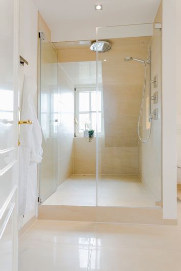 Das Hartschaum-Duschtassenelement im Format von 1900 x 1350 mm besitzt ein integriertes Gefälle von 150 auf 135 mm. Da im Geschossboden zu wenig Aufbauhöhe für die Ablauftechnik vorhanden war, wurde die für ältere Gebäude entwickelte Step-Up-Lösung gewählt und ein 105 mm hohes Unterbauelement plus einer 45 mm starken Duschtasse eingebaut. Bei Familie Mayer handelte es sich um eine Spezialanfertigung. Standardformate sind im LUX ELEMENTS Sortiment in großer Auswahl vorhanden. Last but not lease wurde die Duschabtrennung zum übrigen Raum ebenfalls mit Hartschaum-Trägerelementen gestaltet. Auch hier wurde individuell eine edel wirkende Nische für die Ablage von Duschutensilien geformt. Christiane Mayer ist von ihrem neuen Bad hellauf begeistert: „Mein Wunschtraum ist Wirklichkeit geworden. Ein Rundum-Wohlfühl-Raum. Ich kann hier herrlich entspannen.“