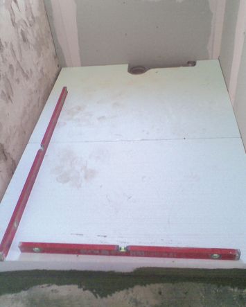 Das Unterbauelement wird auf dem Boden auf Ansetzkleber COL-AK verklebt und die Aussparung für den Rohrverlauf ausgeschnitten. Mit der Wasserwaage wird die gerade Ausrichtung überprüft ...