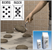 Nach ca. 3 Stunden dübeln. Entsprechend dem vorhandenen Mauerwerk und Putzdicke den richtigen Dübel oder Befestigungssatz aussuchen. Vorsicht wegen Wasser- und Stromleitungen. Wir empfehlen 6 – 8 Dübel pro qm.