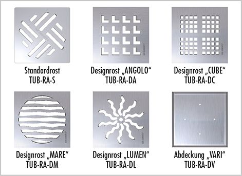 Bei diesem Bodenablaufsystem können unterschiedliche Bodenablauf-Stutzen, senkrecht oder waagerecht, mit acht Rostvarianten (inklusive Rostaufnahme) kombiniert werden.
