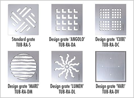 In this floor drain system, different floor drain supports, vertical or horizontal can be combined with eight grate variants (including grate fitting frame).