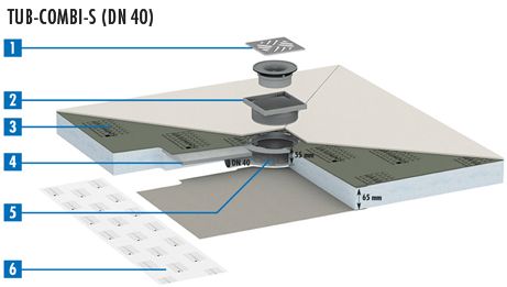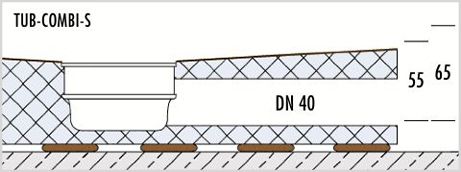The TUB-COMBI models combine a shower base or shower drain elements with a horizontal floor drain, which is already integrated. The substrate element is therefore omitted and the shower base is particularly flat.