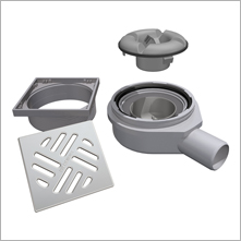 As an alternative to the combinable floor drain systems, the standard grate is available as a complete set with grate fitting frame and vertical or horizontal floor drain support.