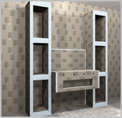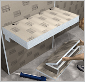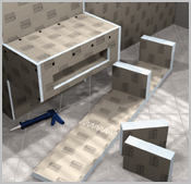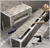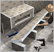 Dresser les étagères terminées, les coller sur le mur et la sous-construction de vasque. Tous les éléments doivent être armés aux raccords avec les composants de système LUX ELEMENTS®-ARM, et les zones armées doivent finalement être noyées avec COL-AK .