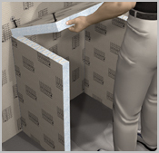 Aligner les éléments latéraux verticalement et horizontalement, tracer, les coller sur le mur et le sol avec COL-MK.