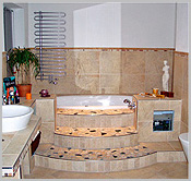 Baignoire balnéo avec podium et tablettes, habillage de mur à l’état carrelé terminé.