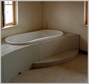 Habillage de baignoire légèrement arrondi avec tablette et podium.