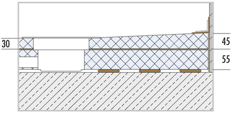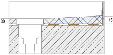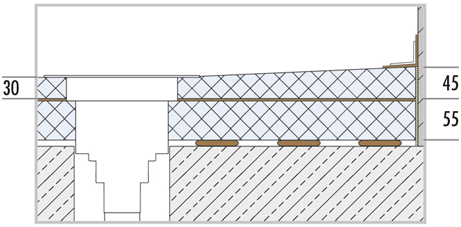 Avec pente intégrée, les receveurs de douche à écoulement en un point présentent une hauteur de 30 à 45 mm ; la hauteur de l'élément de compensation est de 55 mm. La hauteur totale de montage est de seulement 100 mm et est parfaitement adaptée à la rénovation d'un bâtiment ancien.