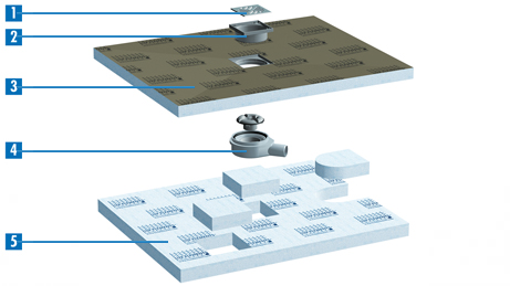 Les receveurs de douche à l'italienne se composent d’un élément porteur en mousse dure, revêtu d’un enduit d’étanchéité sur la face supérieure, avec cadre de réception pour siphon de sol intégré et étanchéifié, 135 x 135 mm.